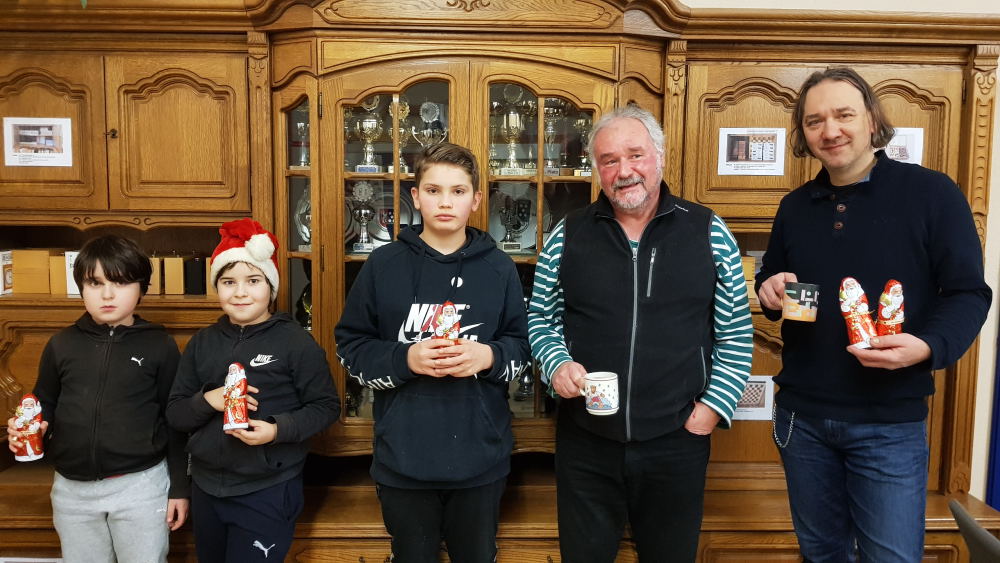 oben: die Kids, die gerne am Training teilgenommen haben, wurden mit Nikoläusen bedacht: Levent, Deniz, Jonas, Julius (via PaKlein), Mirco, Milan (via Rüdiger), Tamir... links: der Glühwein wurde vom "Weihnachtsmann" Werner Roos gestiftet, herzlichen Dank dafür... ein paar nette Partien "Jung vs Alt" sorgten für viel Spaß, Freude und Entspannung. ➔ Überraschung: "John Haygood is back in town", er könnte die 2.Mannschaft unterstützen, Nachmeldung läuft ➔ Schließung des Clubs: bis einschließlich 04.01.2020 kein Schach und danach spielen die Kids Meisterschaften !? die Redaktion wünscht..."Allen besinnliche Feiertage und guten Rutsch"