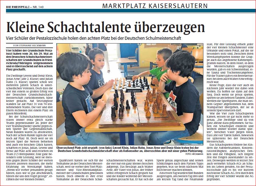 geworden, ausgetragen als "Online"-Meisterschaft, CORONA sei es gedankt :-). Julian Hahn aus KL komplettierte das 4er-team. Da es sich um eine "Blitz"-Meldung handelt, werden Daten und Statistiken noch nachgereicht ! Vorab einen herzlichen Glückwunsch zu eurem grossen Erfolg, und der Dank gilt auch allen Unterstützern, Förderern und Betreuern ! ➔ Nachtrag vom 21.06.2020: Die Mühlen der Turnier-Nachbearbeitung mahlen bisweilen langsam, dafür stetig und so kommt ein erster Teil mit Bild der "Glorreichen 4" unter folgendem link der RLPSJ... RLP-Schachjugend wer noch "DOSSM 2020 WK G" anklickt und nachfolgend bspw. auf die "Pestalozzischule" klickt, erfährt mehr, u.a. Einzelergebnisse, usw. M.W. zählen vorrangig die Brettpunkteupdate 14.06.2020: dankbar für jede interessante Mitteilung in diesen trostlosen Zeiten der Enthaltsamkeit hinsichtlich Brett-Schach und gesellschaftlichem Miteinander, vermelde ich gerne Aktivitäten der Kinder von Fam. Klein und Arne, sowie Julian Hahn im online-Schach. Die ersten Runden in der Deutschen Grundschul-Schach-Meisterschaft sind online schon gespielt, und nach der 3.Runde führen die Jungs überraschend die Tabelle an ! Das macht stolz, wer das gerne verfolgen möchte, hier die links dazu DSJ liveticker DSJ Zwischenstand